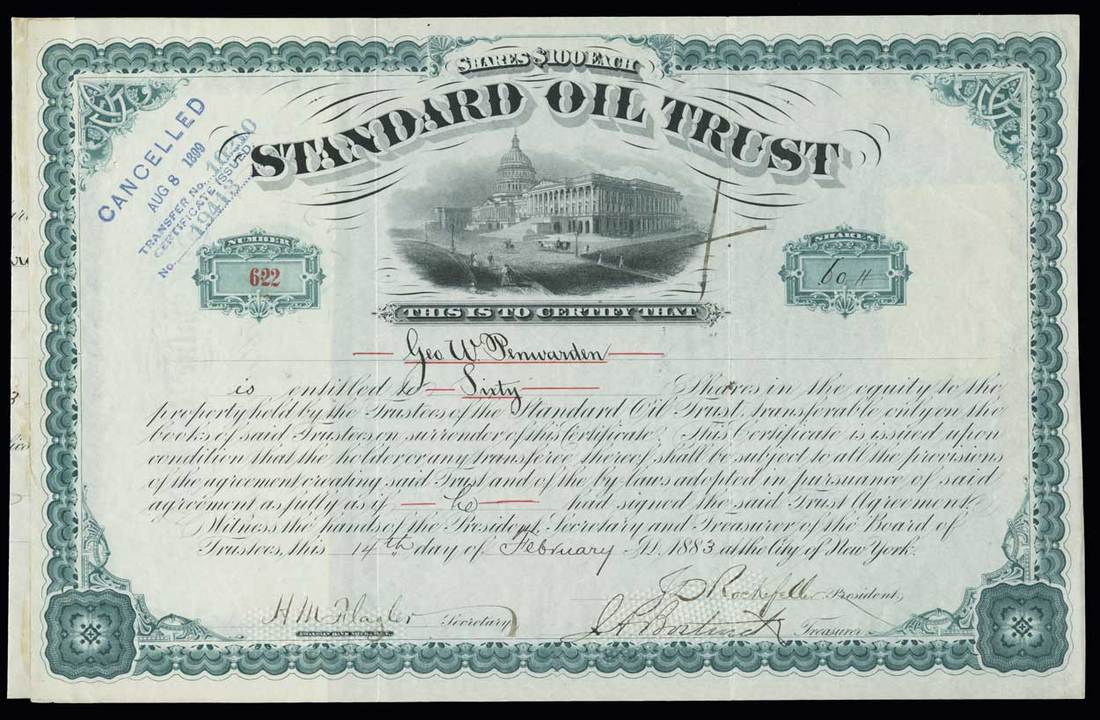 Standard Oil Trust 1883. 60 shares. Issued, cancelled. No.622. Green. Capitol Building. Issued to George W. Penwarden. Signed by John D. Rockefeller as President, Henry M. Flagler as Secretary, and Jabez A. Bostwick as Treasurer. Green. VF+, with a pen cancel near the vignette, and with unobtrusive machine cancels through the signatures. The Standard Oil Trust was conceived as a way to get around Federal anti-monopoly policies. By 1890 Standard Oil controlled 88% of the refined oil in the United States. In 1892, the state of Ohio successfully sued Standard Oil and broke the Trust. The Trust was then reborn, this time as a holding company. John D. Rockefeller made his fortune by leaving the discovery of oil to the wildcatters and speculators. Instead, he concentrated on the transportation, distribution and sale of petroleum products. He became one of the richest men in the world, building a fortune estimated at close to a billion dollars.