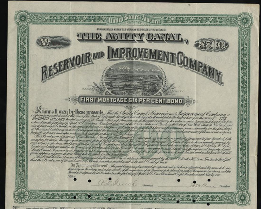 Amity Canal, Reservoir and Improvement Company (Colorado) 1892. $500. First Mortgage Six Per Cent Bond. Green. Canal winding through the countryside. Signed by Charles Dow, (Dow Jones & Company founder) twice on the verso. VF. One corner is a bit rough.