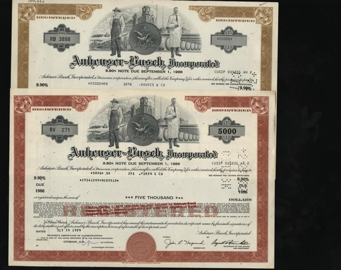 Anheuser-Busch Incorporated Share Certificates. 1980s. Issued, cancelled. Brown. Company logo (eagle and A), brewery, farmer and brewer. Mostly VF+, but three have stains or other imperfections. [10]