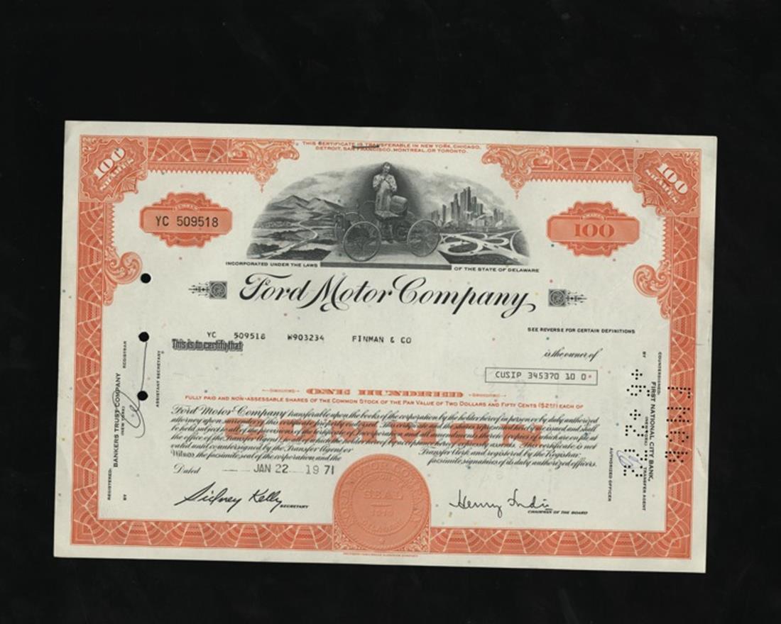 Automobile Bonds and Shares. Ford Motor Co., mostly 1970s(20); Four Wheel Drive Auto 1962 piece out of margin; General Motors Corporation 1954 $1000(20); Kaiser-Frazer 1945(3); Lincoln Motor 1921 signed by Nash and Leland; Peerless Motor Car 1930; Studebaker 1965. Also included, General Motors 1969 and Ford International Capital 1969. Mostly VF. [49]