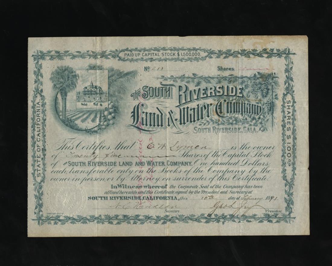 California Bonds and Shares. South Riverside Land & Water Co. 1891; Farmers' Union of San Jose 1890; City and County of San Francisco $1000 Water Bond 1910; California Improvement Co. of Illinois 1902, stained at left; Sierra Railway Co. of California $1000 1897 unissued. VF+ to EF. [5]