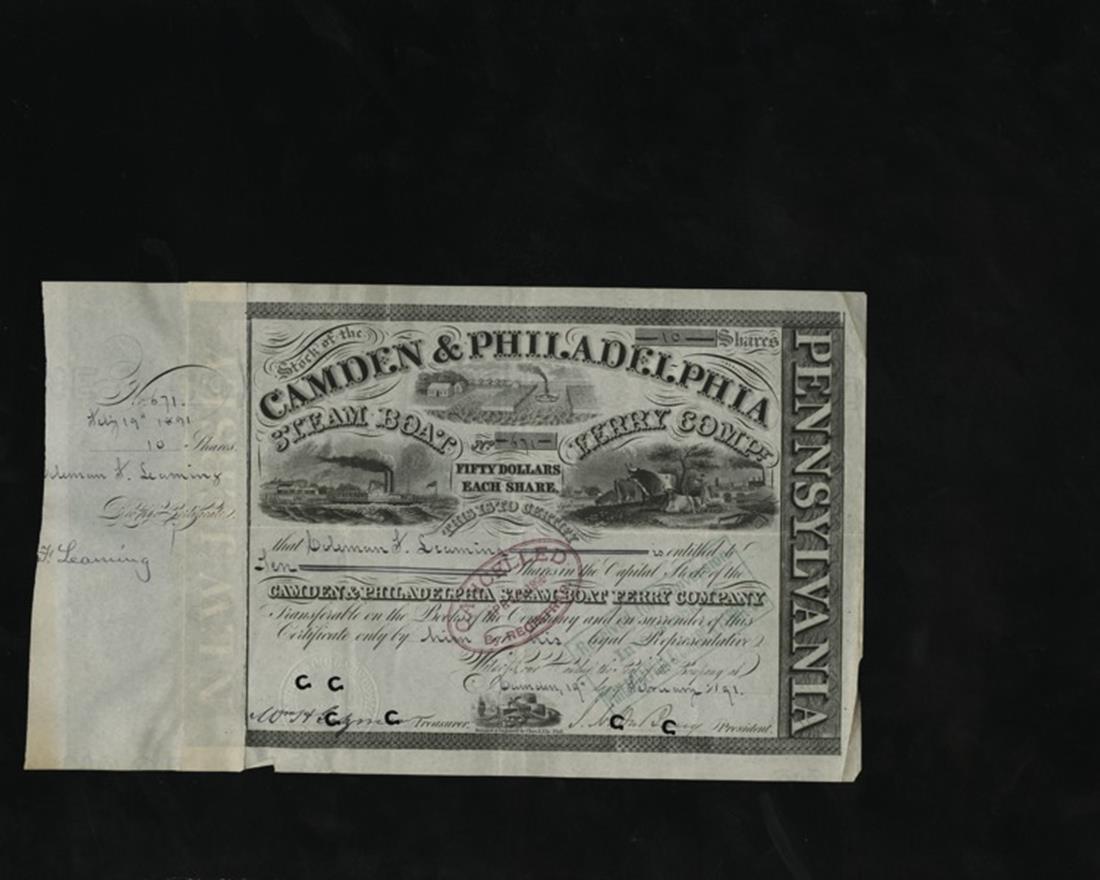 Camden & Philadelphia Steam Boat Ferry Company. (Pennsylvania) 1889. Camden. Issued, cancelled. No.618, 626, 671. Ferry, steamboat and cows. Designed and engraved by Charles Ely, Philadelphia. VF+. All with stubs lightly affixed over the left borders. Bright and attractive. [3]