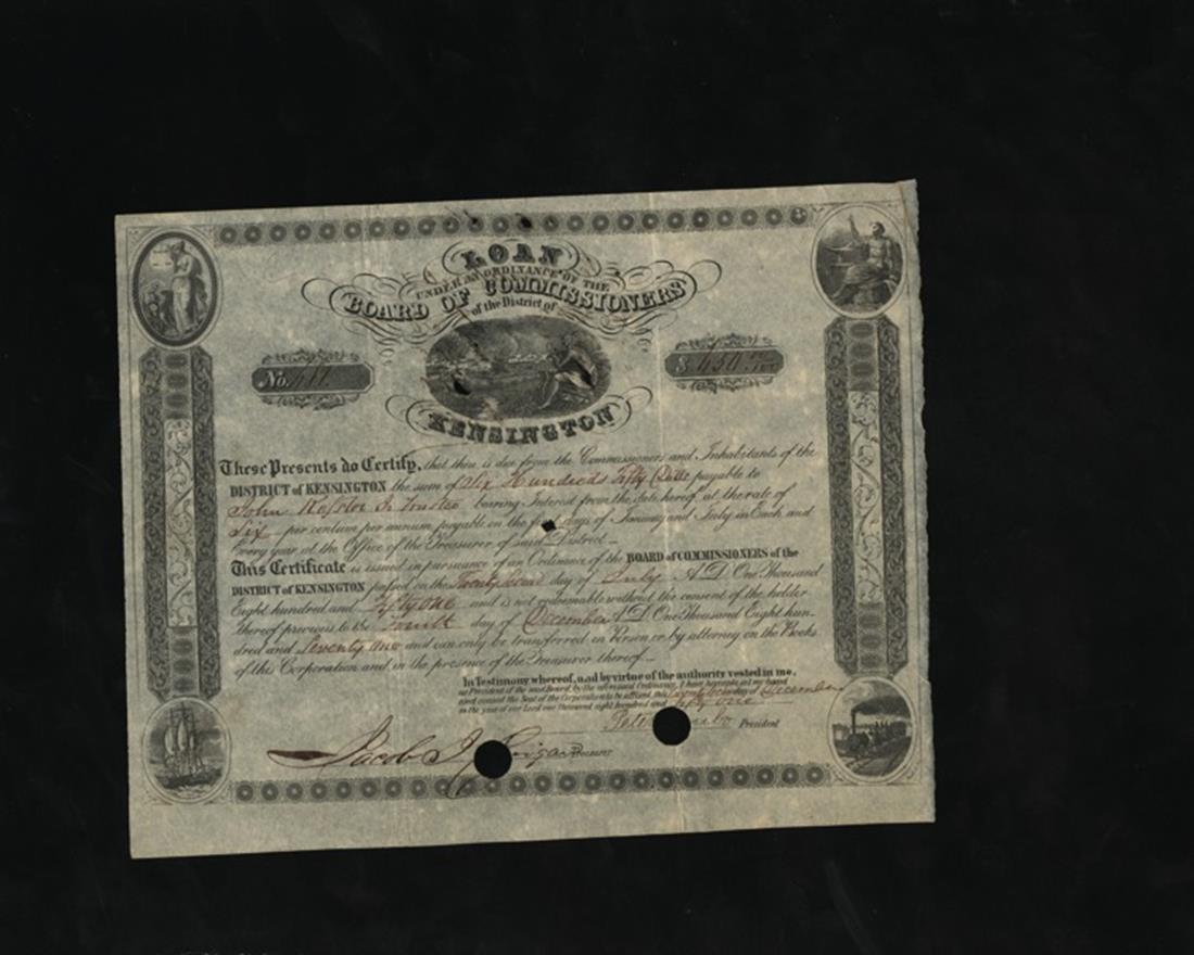 Board of Commissioners of the District of Kensington (Pennsylvania) 1851. $650. Six per cent bond. Issued, cancelled. No.681. Indian sees civilization. VF. A few small body holes.