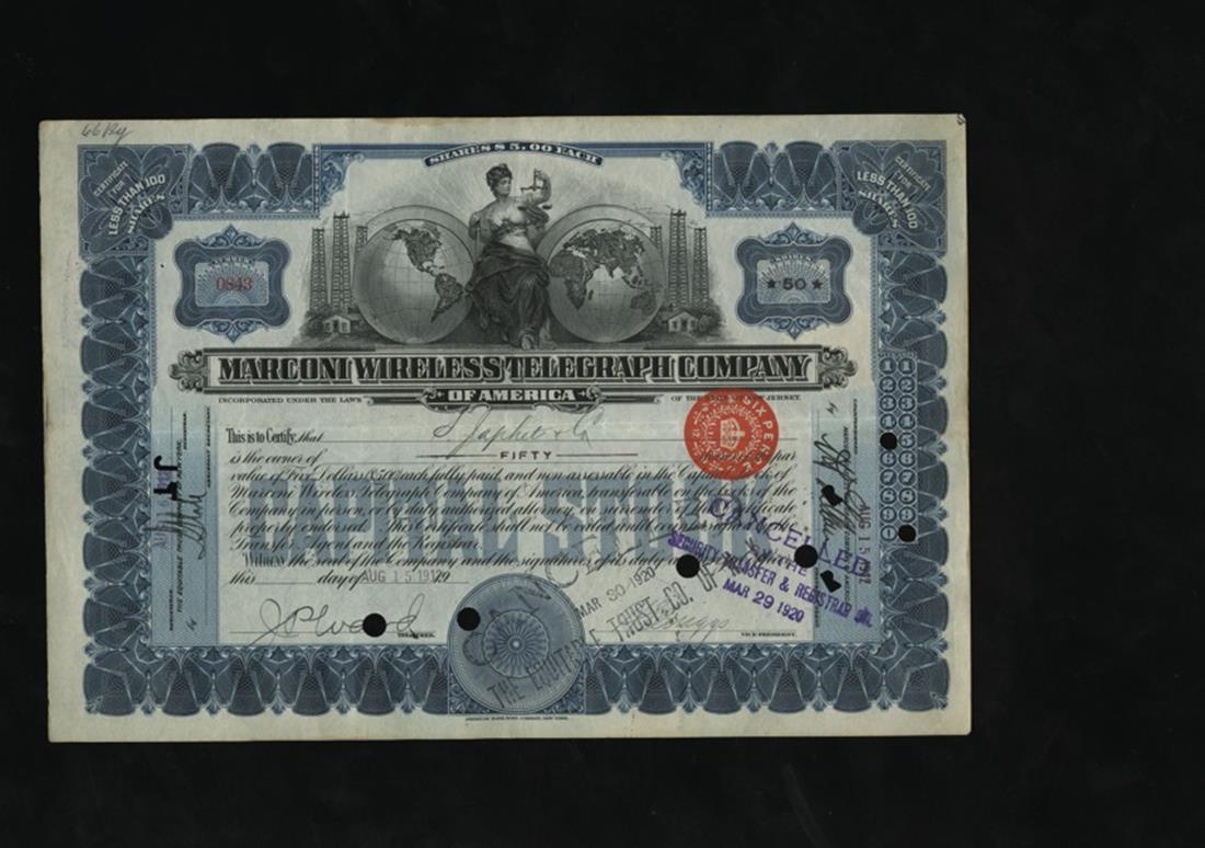 Marconi Wireless Telegraph Company (New Jersey) 1912-1913. Shares. Issued, cancelled. Blue with red British imprinted revenue stamps. Justice seated between both hemispheres. ABNCO. VF+ on average. One has a stain, but the others are nice. [10]