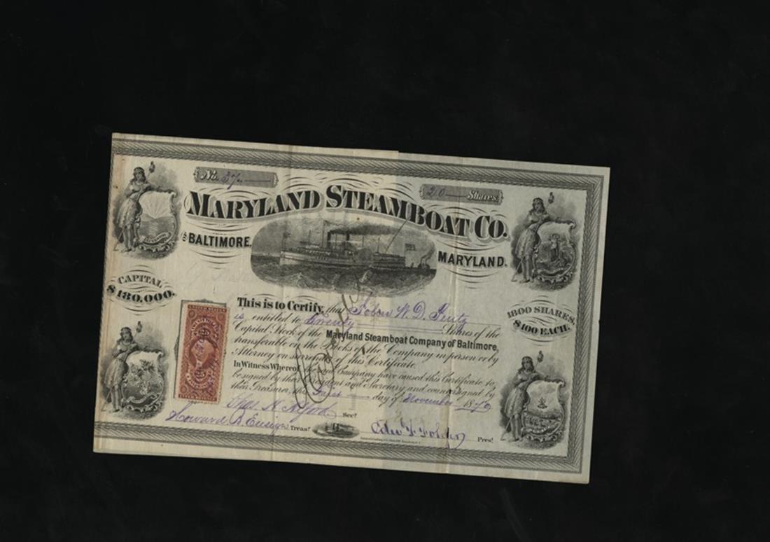 Maryland Steamboat Co. of Baltimore (Maryland) 1879. 20 shares. Issued, cancelled. No.37. Steamboat. Indian Princesses and State arms in the corners. VF. The stub is affixed to the left border.