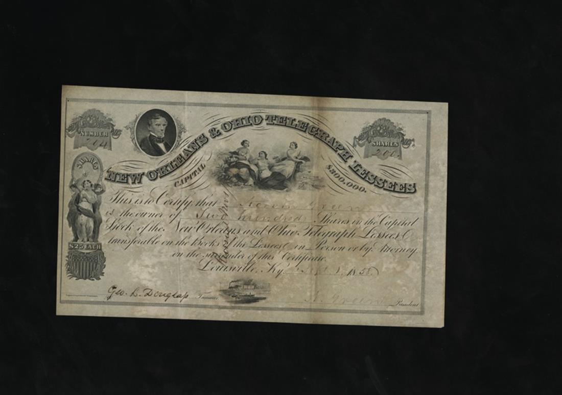New Orleans & Ohio Telegraph Lessees (Kentucky) 1858. Louisville. 200 shares. No.204. Three women. Samuel Morse. Woman holding SHARES. Train and barge below. Issued to Norvin Green, and signed by him as President. Fine details. Some light to moderate staining, and cut cancelled, though nice for this issue which is almost always found in wretched condition. Also included is a second example, in similar condition, issued to Thomas Carter, signed by Norvin Green as President. [2]