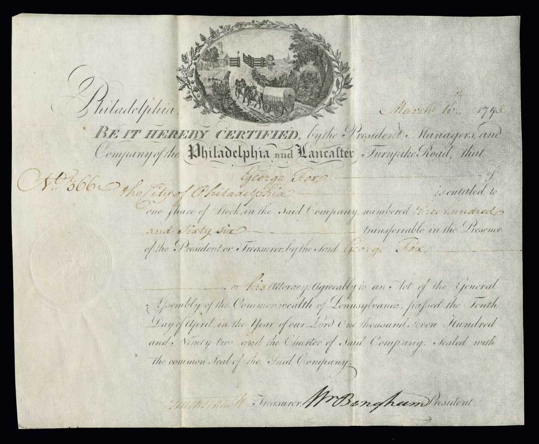 Philadelphia and Lancaster Turnpike Road (Pennsylvania) 1795. 366 shares. Issued, uncancelled. No.366. Covered wagon approaches the entrance to the turnpike road. Printed on vellum from a metal plate, this issue is the earliest known use of a pictorial engraved vignette on an American stock certificate. Signed by William Bingham as President. William Bingham began his business career as an apprentice for Thomas Wharton, a prominent Philadelphia merchant. He later made a fortune during the American Revolution procuring munitions and produce for the army, and investing in privateering ventures. Bingham was one of the leading Philadelphia socialites, and one of the founders and director of the Bank of North America. EF.