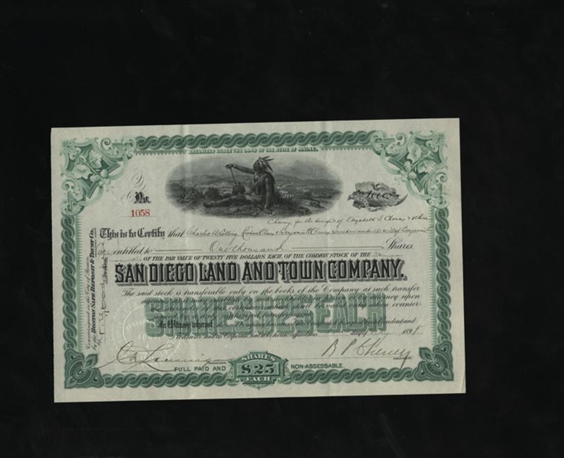 San Diego Land and Town Company Pairing. (Maine) 1898. 1000 shares. Issued, not cancelled. No.1058 & 1060. Indian sees civilization. Both signed by Benjamin P. Cheney. Benjamin Pierce Cheney (1815-1895) was a self-made millionaire, largest single shareholder in the American Express Company, and had a huge influence on the affairs of the Northern Pacific. ABNCO. EF. Fresh and bright. [2]