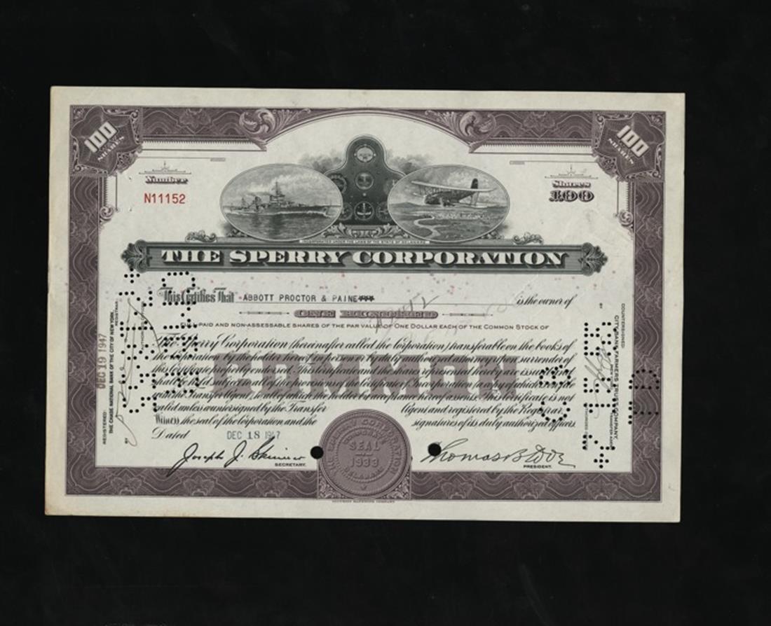 Sperry Corporation Grouping .(Delaware) Mostly 1940s and 1950s. Shares. Issued, cancelled. Brown and red. Instrument panel flanked by a naval ship and airplane. Mostly EF.