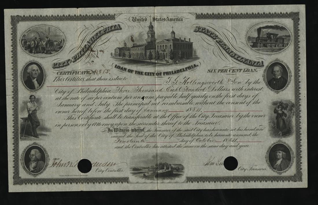 State and City Bonds and Warrants. Montana: Special Sidewalk and Curb Warrant, Great Falls 1916. Nevada: State Controller's Warrant 1876 $60, cut cancelled. New York: Comptrollers Office New York State Stock $1000 1841, some bleed through from back endorsements; Essex County Volunteer War Bond 1864. Louisiana: State of Louisiana $1000 1890. Pennsylvania: City of Philadelphia Loans 1854, 1855 and 1861. Some with small edge splits. City of Providence (Rhode Island) bonds, 1892-1930s, mostly vertical format bonds, and one unissued. All VF+ unless otherwise mentioned. [19]