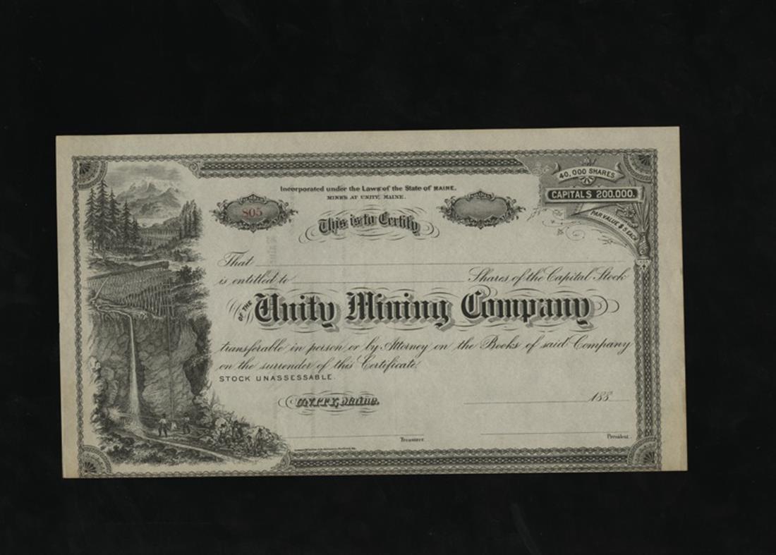 Better Unissued Share Certificates. 1880s. Unity Mining(Maine); Salero Mining & Manufacturing (Arizona Territory); Chicago Cotton Manufacturing (Illinois), building, and orange underprint(3); Puget Sound Commercial Co. (Washington Territory) Port Gamble, wonderful custom vignettes by Briton-Rey; Searight Cattle Co. (Territory of Wyoming); Juniata Mining & Manufacturing Co. (Pennsylvania) Blair County;(4). Mostly EF. [11] All are quite attractive.