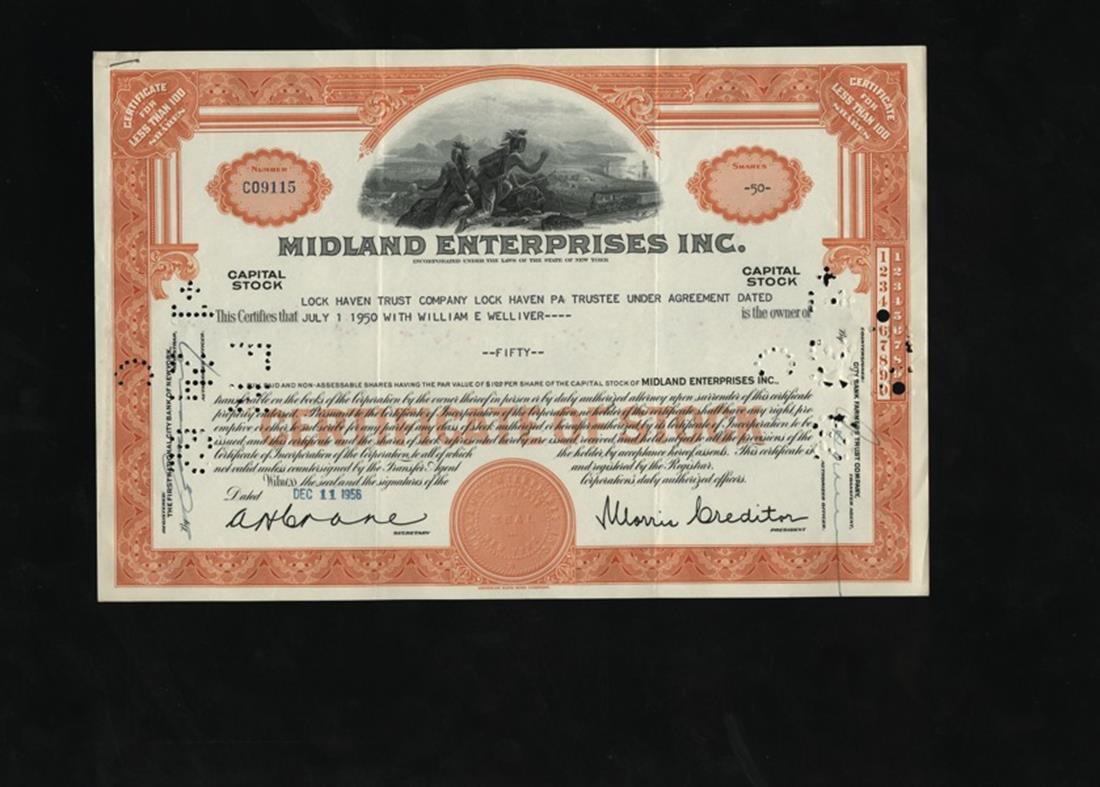 A Nice Assortment of Stocks and Bonds in Small Groups, Ready for Retail. All are bright, colorful, and with nicely executed images. Constant Refining Company 1925(5); Hershey Chocolate Corporation(20); Midland Enterprises, Inc. 1950s(5); Milliken Company 1917(6); National Tea Company 1930s(20); Scott Paper Company 1960s(6); S. D. Warren Company 1920s to 1950s(15); South Puerto Rico Sugar company 1960s(10); United States Steel Corporation 1930s and 1940s(20). Mostly EF. All are issued and cancelled. [107]
