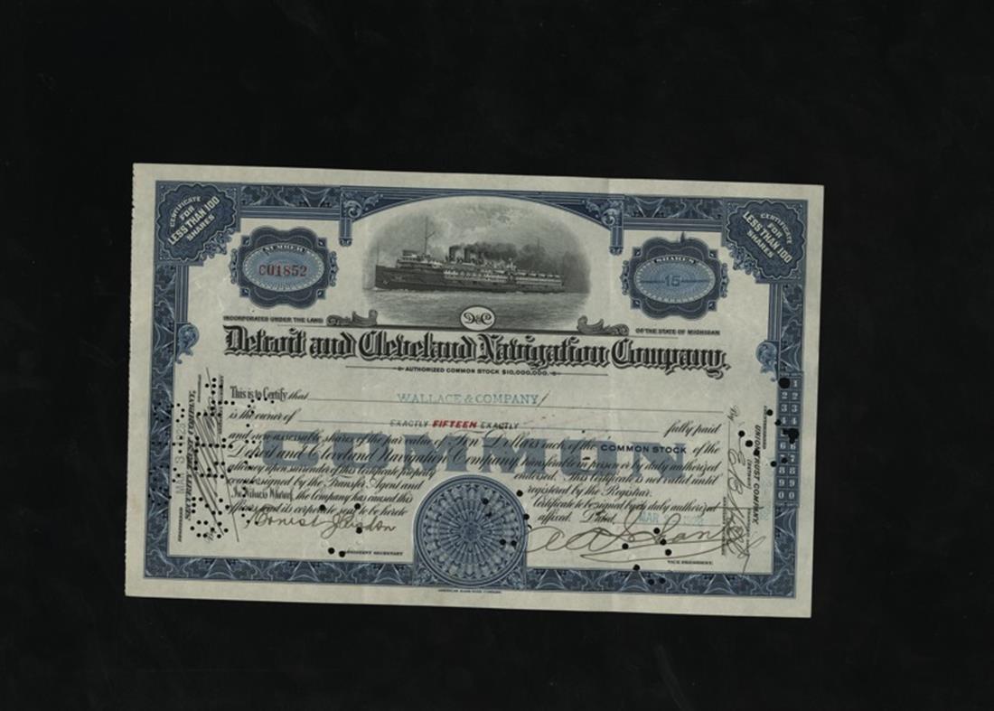 Shipping Shares Assortment. 1920s and 1930s Submarine Signal Company(6), ship in a gale; International Mercantile Marine(10), ocean liner, numerous punch cancels; Detroit and Cleveland Navigation Company, steamship. Mostly VF+. [17]