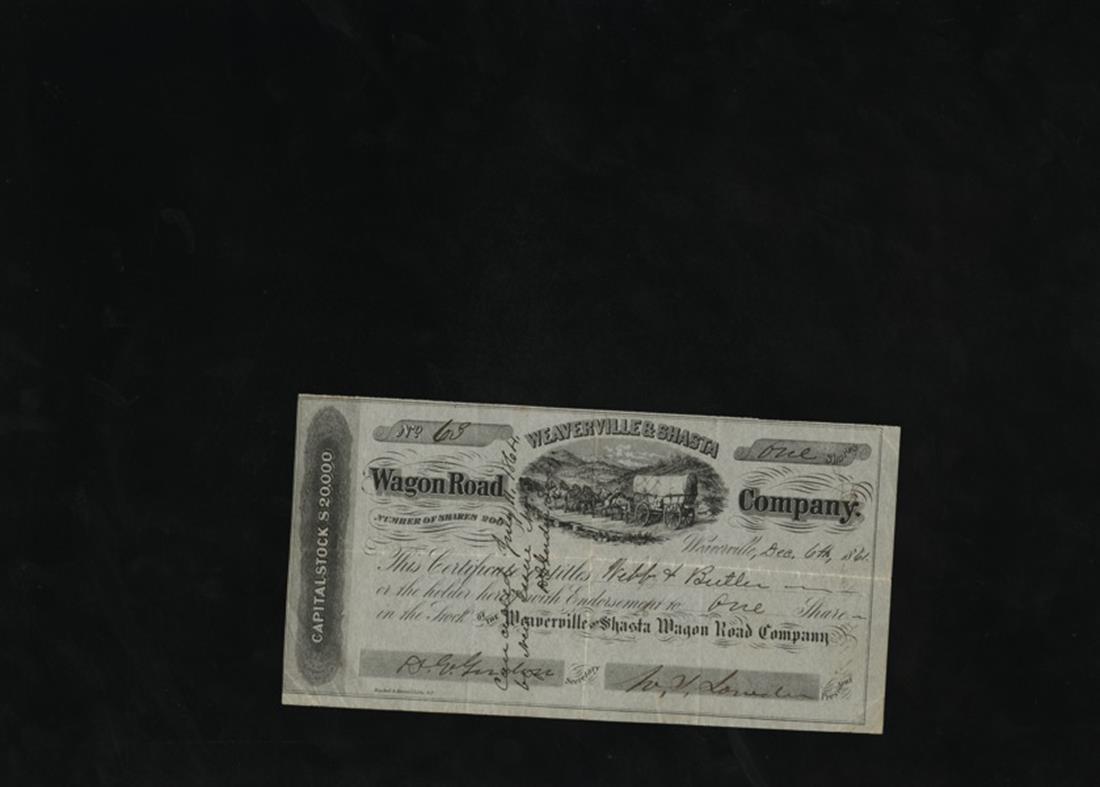 Weaverville & Shasta Wagon Road Company (California) 1861. One share. Issued, cancelled. No.63. Covered wagon pulled by four horses. Capital stock $20,000. When the road opened freight that could only be packed in by mules was now easily handled by covered wagons. The success of this road lead to the construction of many others throughout the region. VF+.