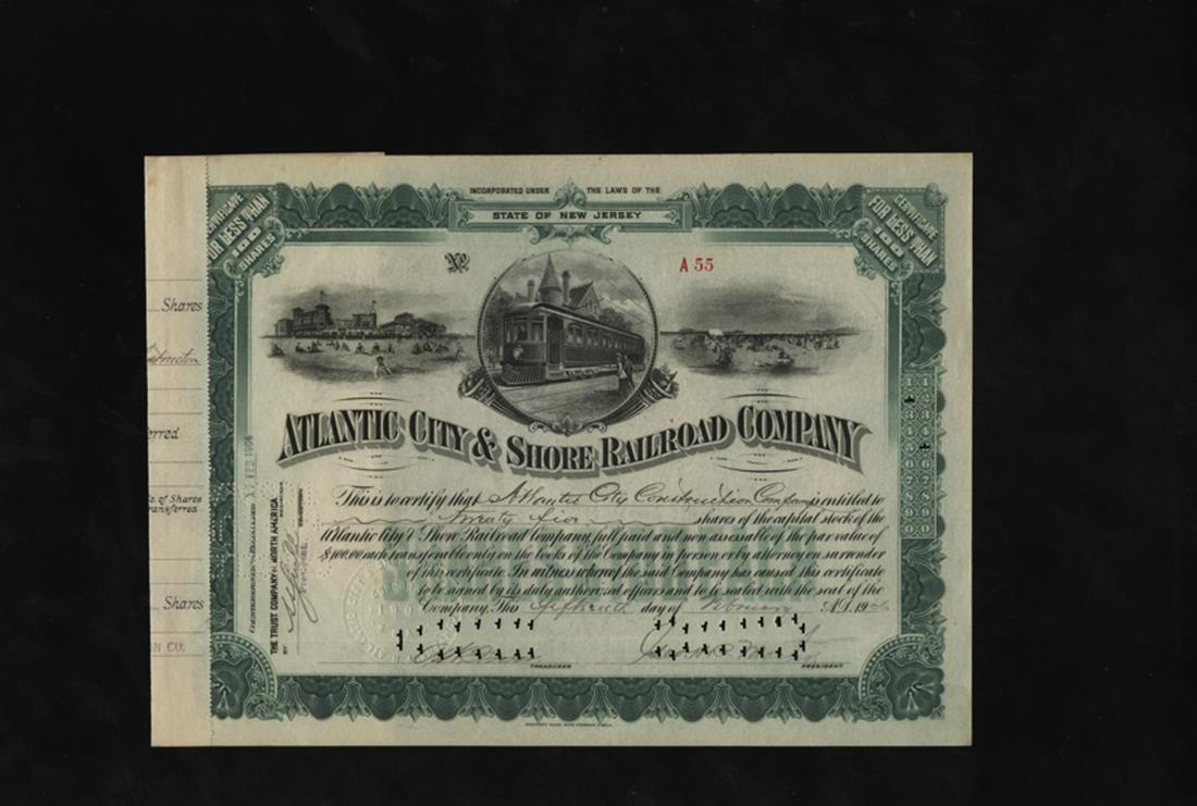 Atlantic City & Shore Railroad Company (New Jersey). 1906. 25 shares. Issued, cancelled. No.A55. Green. Streetcar in circular frame, flanked by beach views. VF+.