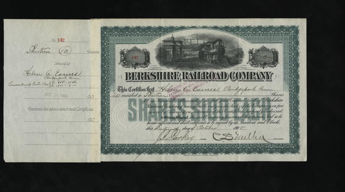 Berkshire Railroad Company (Massachusetts). 1905. 13 shares. Issued, cancelled. No.142. Green. Train; signals beyond. Signed by C. S. Mellon as President. ABNCO LITHO. EF.