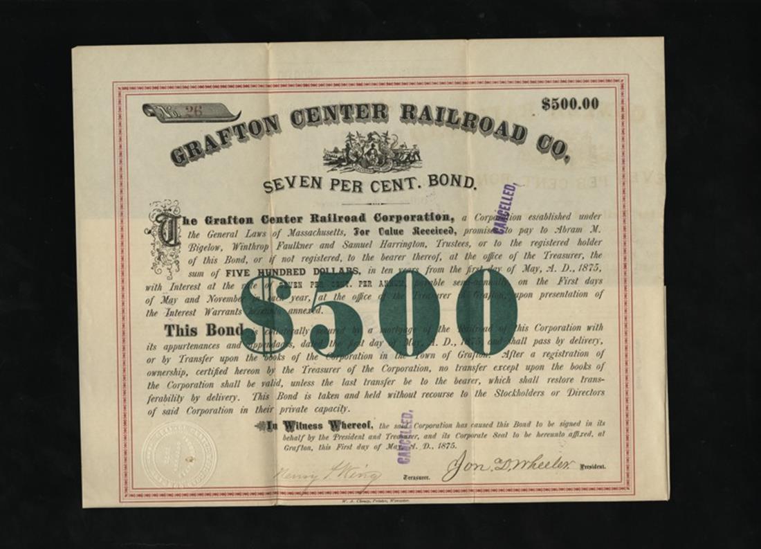 Grafton Center Railroad Co. (Massachusetts). 1875. Grafton. $500. Seven Per Cent Bond. Issued, cancelled. No.26. Red frame, Green $500 at center. State arms. W. A. Cheney. VF+.