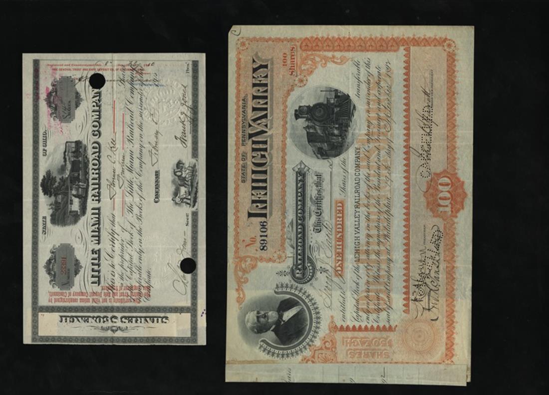Missouri, Kansas and Texas Stock and Bond Assortment and Others. Missouri, Kansas and Texas Railroad(18) 1880s-1940s, IC; Little Miami Railroad(2) 1910 and 1911 IC; Lehigh Valley RR 1892; Cleveland, Columbus and Cincinnati RR(3) 1870s and 1880s IC. Mostly VF to VF+. [23]