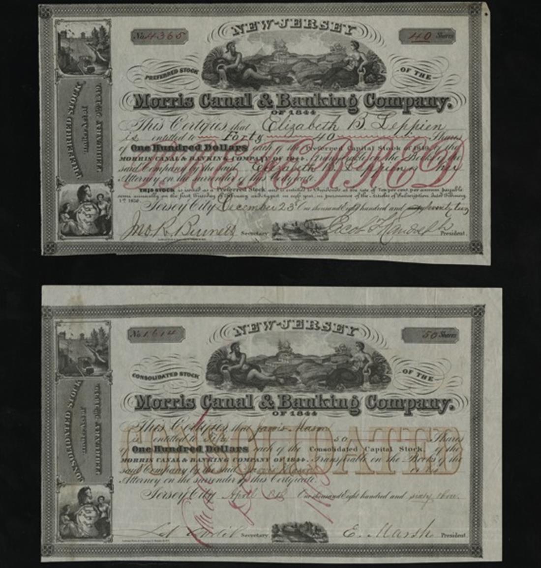 Morris Canal & Banking of 1844 (New Jersey). 1863. 50 shares. Consolidated in red IC. ; 1872. Preferred in red. IU. Trimmed close at top and bottom. Both VF+. [2]
