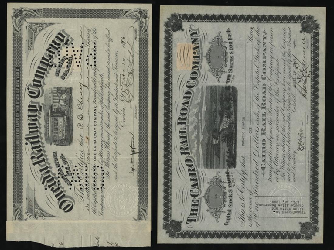 New York Rail Shares. Oneida Rwy 1896 horse drawn street car IC; Cairo RR 1906 river and hills IC; Cayadutta RR 1893 IC; Cooperstown & Susquehanna Valley RR 1888 $100 bond IU. Average VF+.[4]