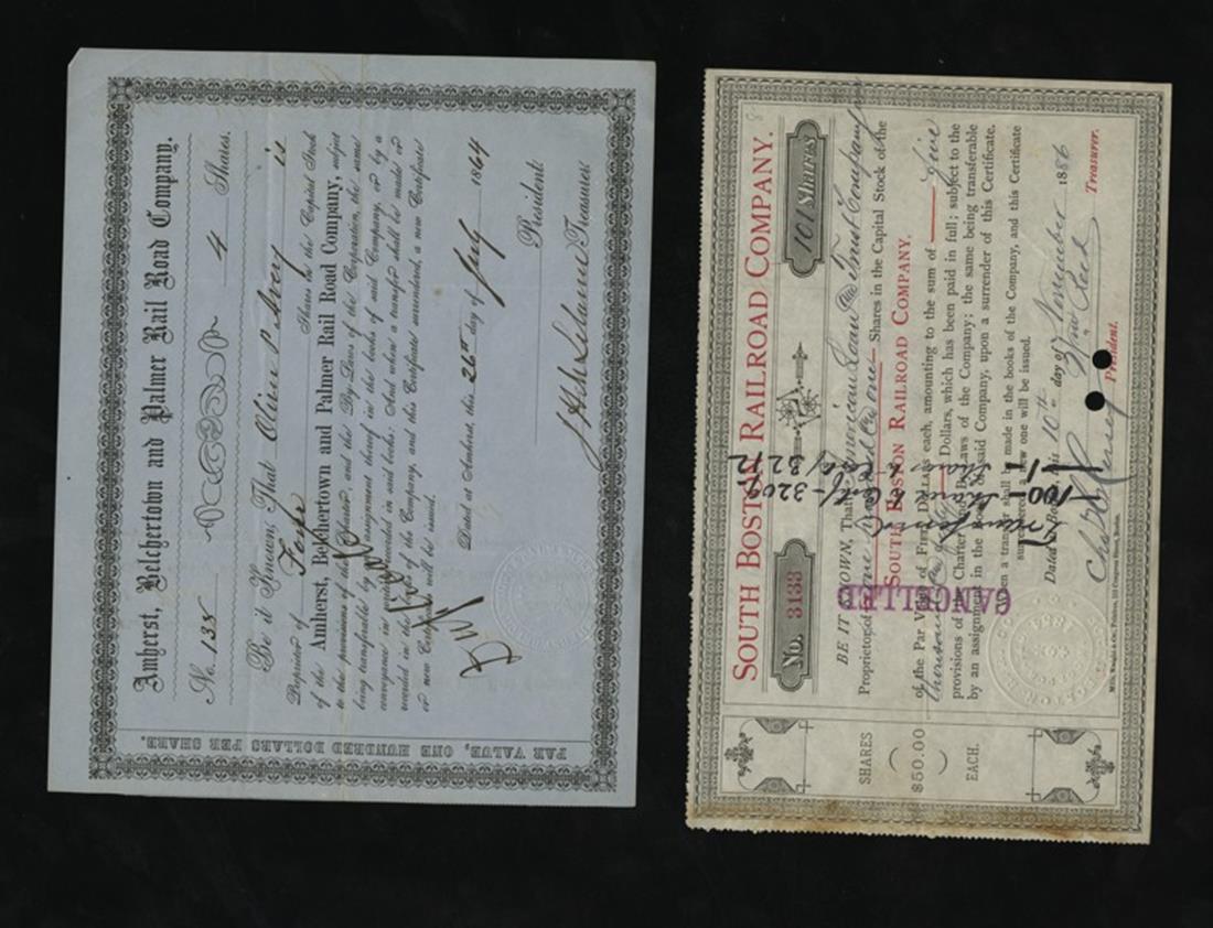 Northeastern Railroad Assortmen.t Amherst, Belchertown and Palmer Rail Road 1864 IC; South Boston RR 1886 heavy transfer notation, IC; Hartford & New Haven RR 1854 IC; New Bedford RR 1873 IU; Northern RR 1870 IU; Old Colony RR 184 IC; Boston & Providence RR 1882 IC; Boston, Clinton, Fitchburg & New Bedford RR 1878 IC. Mostly VF to VF+. [8]