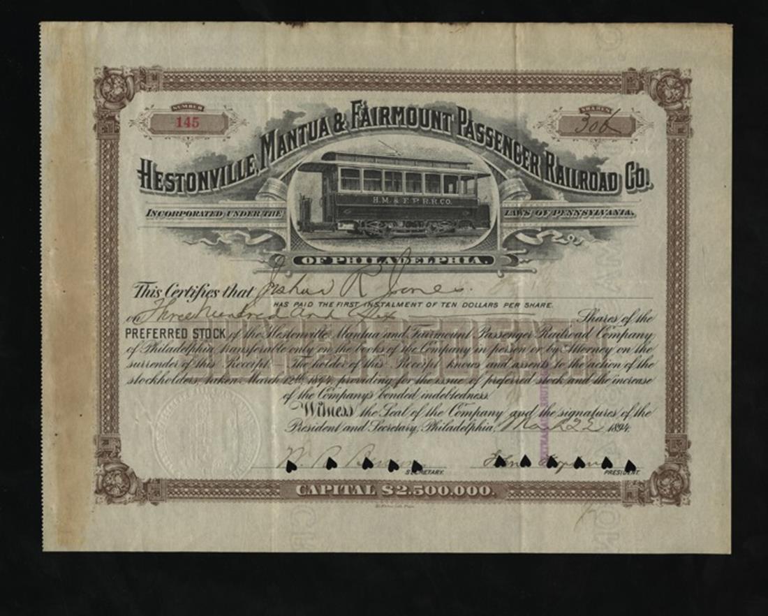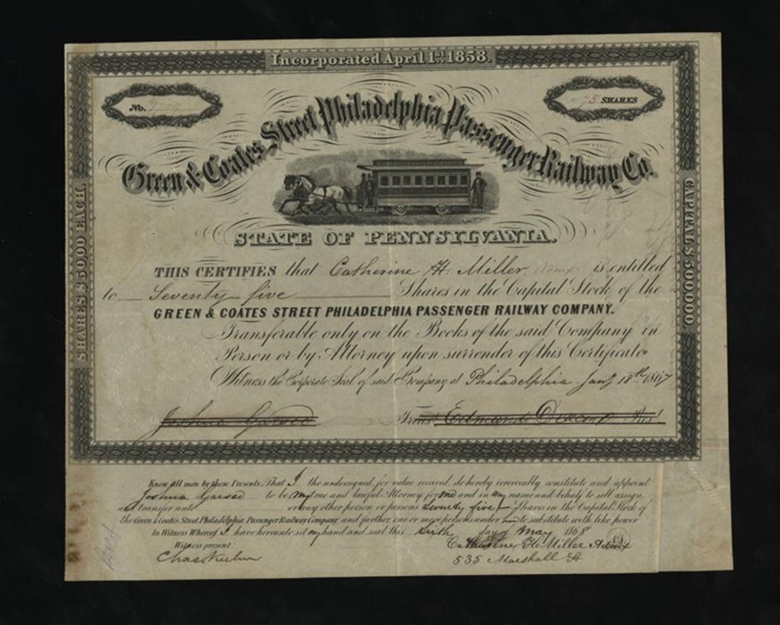 Pennsylvania Passenger Rail Pair. Green & Coates Street Philadelphia Passenger Railway 1897, streetcar, IU, VF; Hestonville, Mantua & Fairmount Passenger Railroad 1894, IC, VF, minor stains, left. [2]