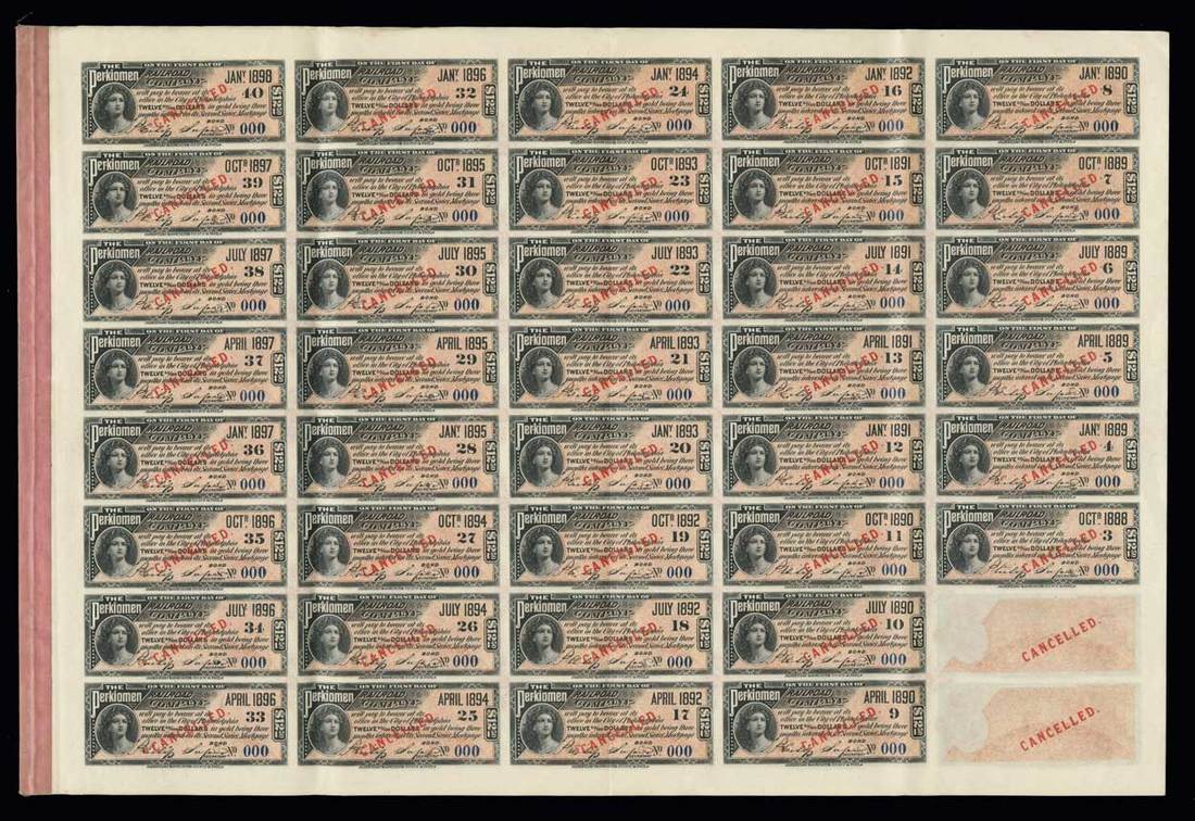 Perkiomen Railroad (Pennsylvania). 1888. $1000. Second Series Mortgage Bond. Specimen. No.000. Red. Train passes three men by lake. State arms below. Never issued in this color. ABNCO. EF. Great eye appeal.
