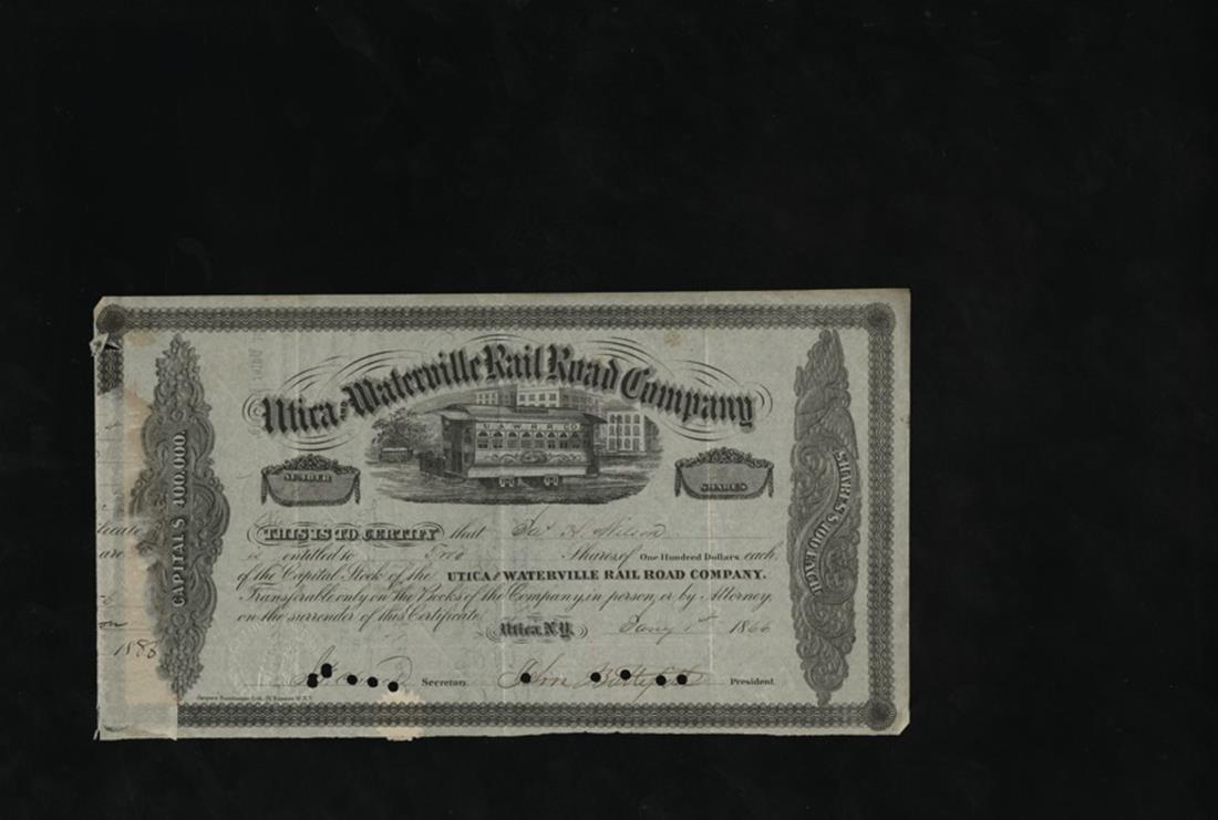 Utica Railroads and John Butterfield. Utica and Waterville Railroad(2), both signed by John Butterfield of American Express fame. One dated 1866 IC, the other only partially prepared, signed by Butterfield. Both VF; Utica and Mohawk Railroad 1887 IC; Utica City Rail Road UU; Utica Belt Line Street Rail Road 1889 IC. [5]