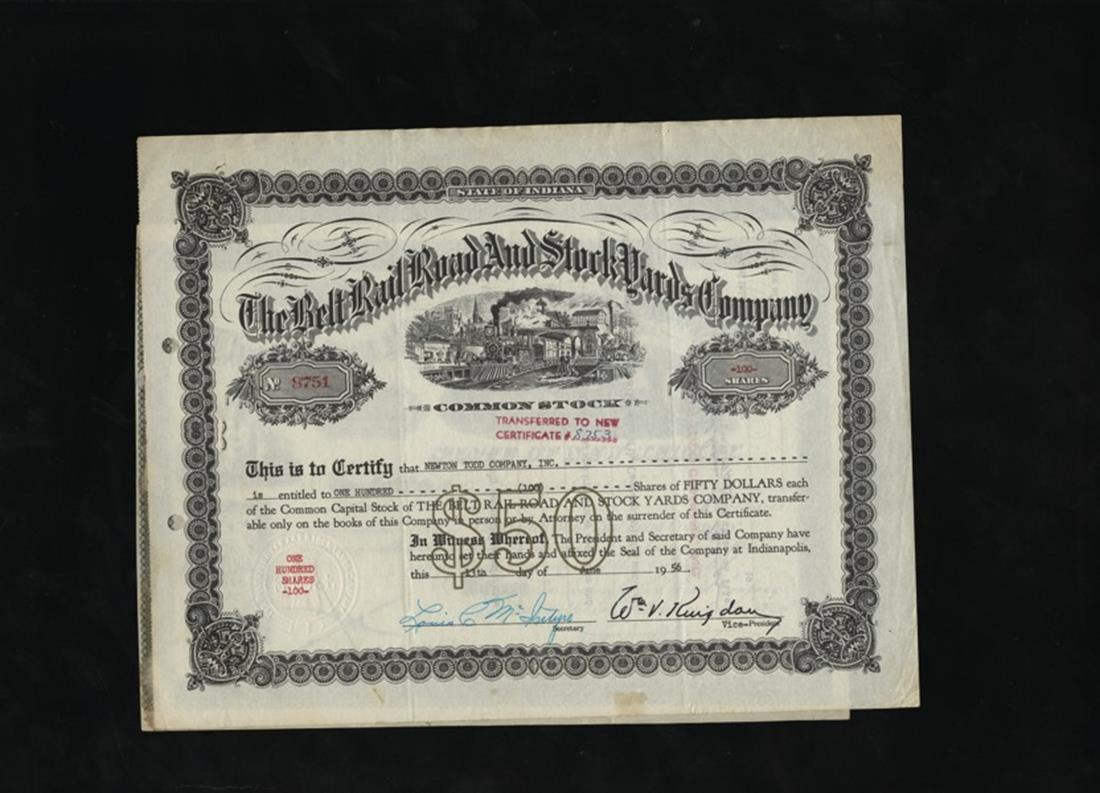 Rail Trio. Washington County Railroad (MD) 1898 IU; Belt Rail Road & Stock Yards (IN) 1956; Ogden Mine Rail Road (NJ) 1894 IC; book page with images of stock and bond layout. VF to VF+ [3]
