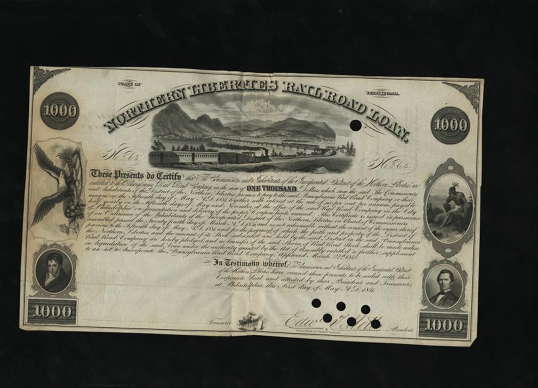 Impaired Assortment of Bonds and Shares. Gettysburg & Harrisburg Rail Road 1884. crayon cancel and tear; Joplin-Pittsburgh Railroad $100 bond 1929. Multiple pin cancels; Danbury & Norwalk RR 1885. Stained left end; Northern Liberties Rail Road Loan, $1000 1851. Graphically appealing, but split in half and repaired. [4]