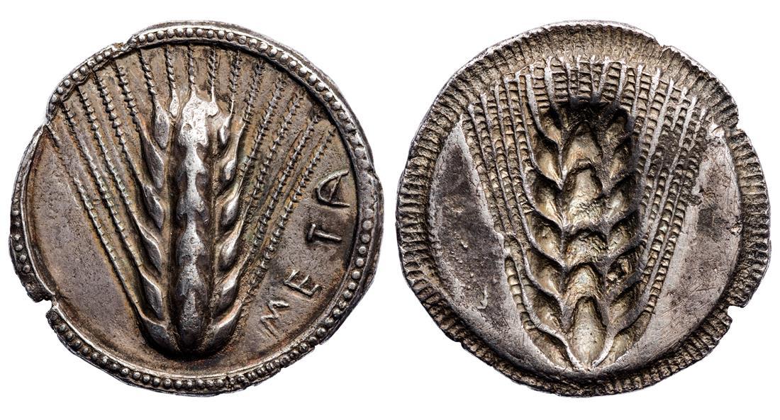 Lucania. Metapontion. AR Stater, ca. 540-510 BC. 7.98 gms. META upwards at right, Ear of barley, rev. Incuse barley ear. Noe Class VI, 116, HN Italy 1478, SNG ANS 209. Good Very Fine.