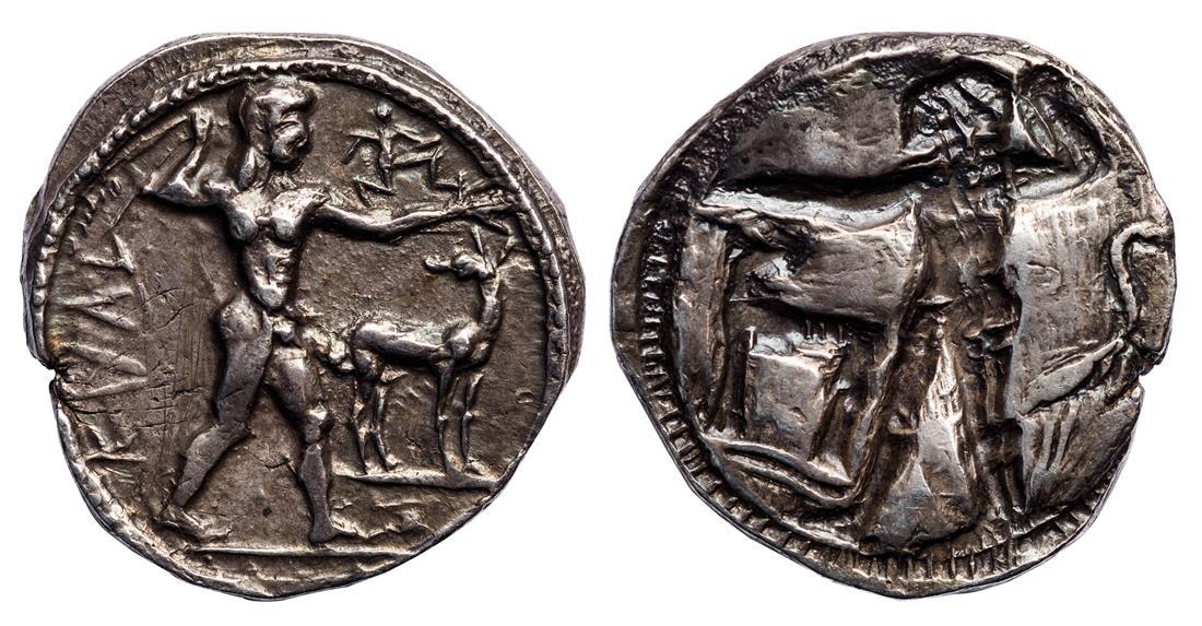 Bruttium. Kaulonia. AR Stater, ca. 475-470 BC.8.15 gms. KAΛV (the “A” inverted), Nude Apollo advancing right, holding laurel branch in his upright right hand, small daimon running right on Apollo’s extended left arm, small stag before, standing right, head reverted, rev. Incuse Apollo and stag, stag’s antlers in relief, to right heron in relief standing right. HN Italy 2043, SNG ANS 162, Noe Caulonia Group D, McClean 1594, Hunterian 4-5. Rare. Overstruck on uncertain issue. Toned pale violet gray with soft iridescent hues over light obverse scratches. Good Very Fine.