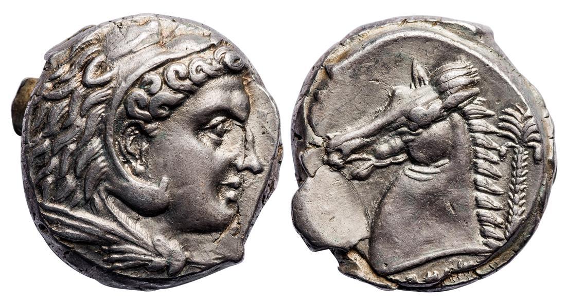 Sicily. Entella. Siculo-Punic issue, ca. 300-289 BC. AR Tetradrachm. 16.96 gms. Herakles head right, clad in lion’s skin, rev. Horse head ¾ left, Punic legend below MHSBM. Jenkins Punic 391, SNG Copenhagen 91. A few minor metal flaws typical for issue. Extremely Fine.