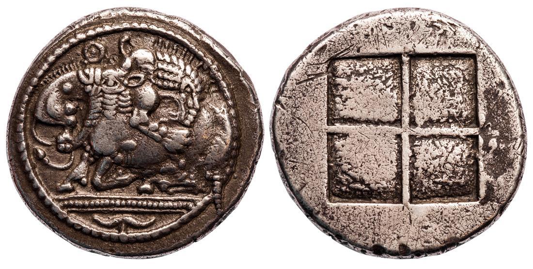 Macedon. Akanthos. AR Tetradrachm ca. 480-470 BC. 16.67 gms. Lion right, attacking bull, kneeling left, the lion’s head in profile biting down on the hindquarters of the bull, pellet in large circle above, beaded exergual line between two solid lines, bow-like floral ornament below, all within braided border, rev. Quadripartite incuse square. Desneaux 63var., AMNG III/2, 4, SNG ANS 10. Good Very Fine.