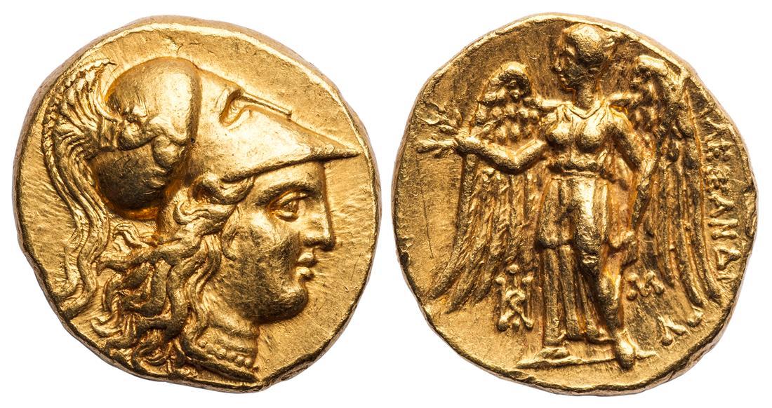 Kings of Macedon. Alexander III, the “Great” (336-323 BC). AV Stater, struck 325-323 BC. “Babylon”. 8.56 gms. Head of Athena right, wearing Corinthian helmet adorned with a sphinx, necklace and pendant earring, rev. (BAΣIΛEΩΣ) AΛEΞANΔPoY, Nike standing left, holding wreath in right hand before her and stylis in her left hand, monogram inner left field, “M” inner right. Price 3595. A few tiny rim nicks. Extremely Fine.