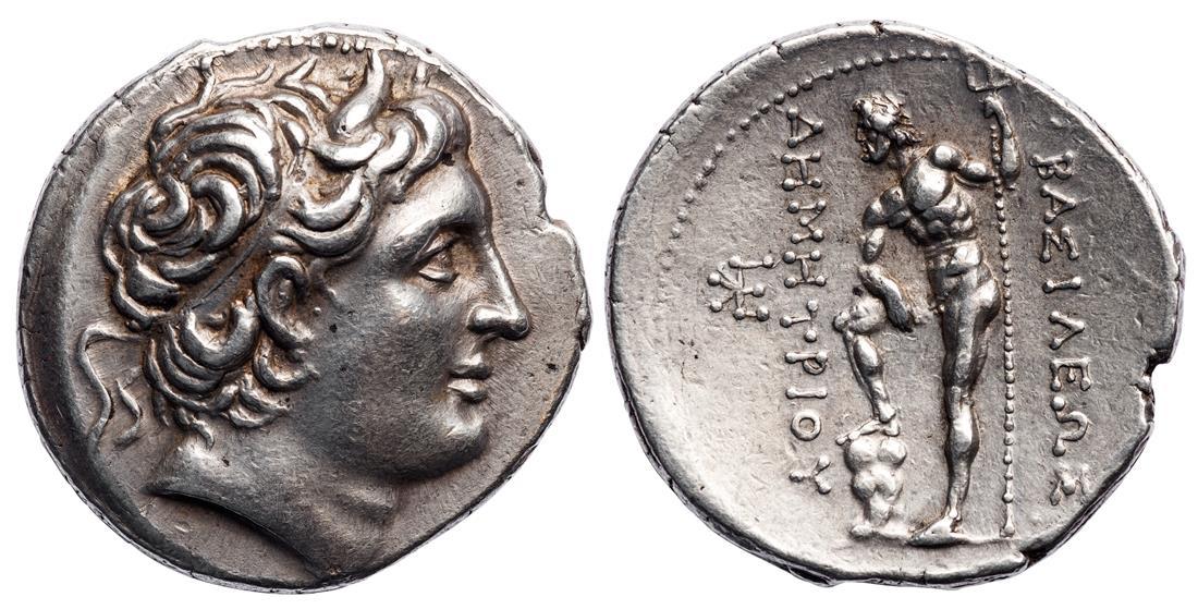 Kings of Macedon. Demetrios I Poliorketes (306-283 BC). AR Tetradrachm, struck ca. 289-288 BC. 17.15 gms. Diademed and horned head right, rev. Poseidon standing left, one foot on rock, holding trident, monogram in far left field. Newell 89. Attractive high-relief portrait. Extremely Fine.