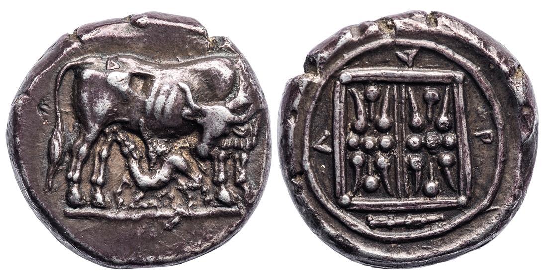 Illyria. Dyrrhachion. AR Stater, ca. 340-280 BC. 10.37 gms. Cow standing right, head facing slightly left, suckling calf, exergual line, rev. Δ (rendered as Λ)-Y-P around double stellate pattern within linear borders, club below, all within circular border in shallow incuse circle. BMC 1var (no exergual line), Maier 7, SNG Copenhagen 421. Sharp strike, rich old tone. Extremely Fine.