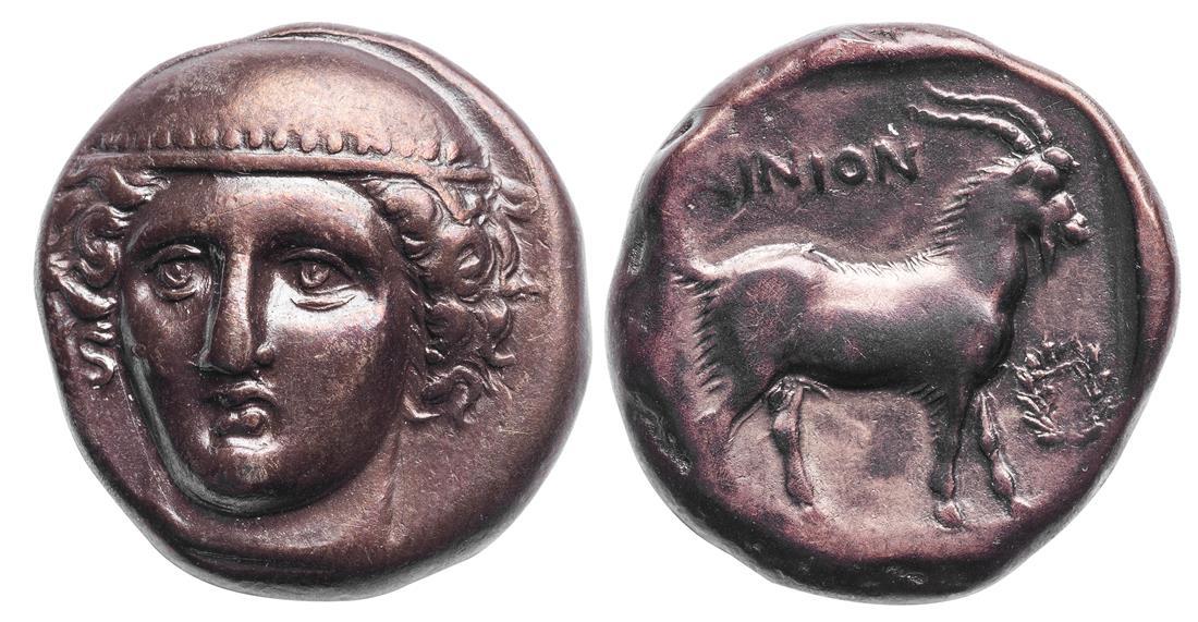 Thrace. Ainos. AR Tetradrachm, ca. 374/3-372/1 BC. 15.63 gms. Head of the city’s patron god Hermes facing ¾ left, wearing petasos with studded rim, rev. AINION, Goat standing right, wreath before, all within shallow incuse square. May, Ainos Group LVI (dies not recorded), AMNG II 328, Dewing 1273. In one of his works, the ancient Cyrene poet Kallimachos writes that the sculptor Epeios who built the Trojan Horse also made a wood statue of Hermes. But “the swollen Scamander” swept it away to sea. It was found by fishermen on the Hebros River. Believing it naught but driftwood, they tried to burn it on their warming fire. When it refused to burn, they threw it back into the waters. But the sea promptly cast it back. The fishermen accepted it as a relic of the gods and built the cultus sanctuary of Hermes Perpheraios (the Wanderer) at the future site of Ainos. Attractive silvery-birch brown patina. Haunting depiction of Hermes of fine style. Near Extremely Fine.