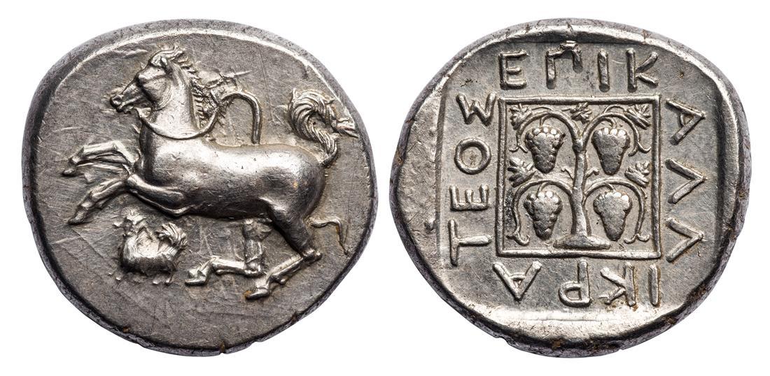 Thrace. Maroneia. AR Stater, ca. 386-347 BC. Kallikrateos, magistrate. 11.41 gms. Horse rearing left, trailing reins, small, long-haired dog left below (resembling a long-haired dachshund), rev. EПI K-AΛΛ-IKPA-TEOΣ around grape arbor in a linear square, all within a shallow, incuse square. Schönert-Geiss 488 (V33/R58), West 84 (same dies), SNG Copenhagen 603 (same dies), Jameson 1061 (same dies), Winterthur 1219 (same dies). A few trivial obverse hairlines. Choice Extremely Fine.