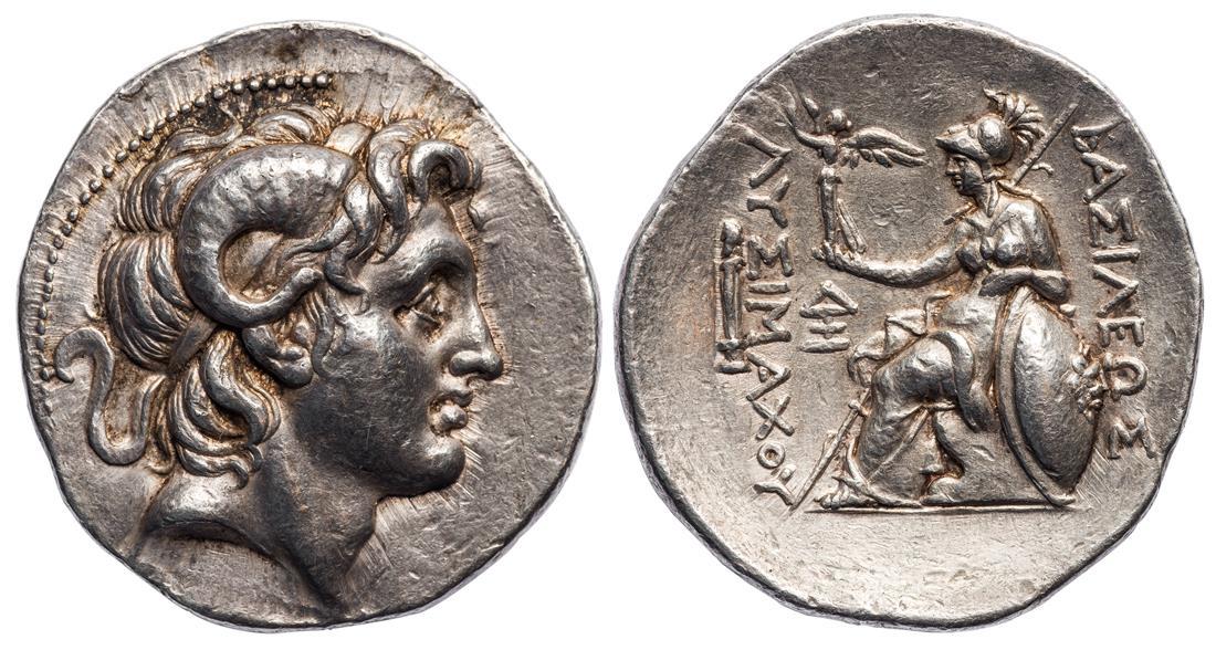 Kings of Thrace. Lysimachos (305-281 BC). AR Tetradrachm, struck ca. 297/6-282/1 BC. Lampsakos. 17.06 gms. Diademed head of the deified Alexander right, wearing the horn of Ammon, rev. BAΣIΛEΩΣ ΛYΣIMAXoY, Athena Nikephoros seated left, resting arm on round shield and holding spear, herm in outer left, monogram inner left. Thompson 50, Müller 91. Trivial dark spot upper obverse field and a few tiny marks. Near Extremely Fine.