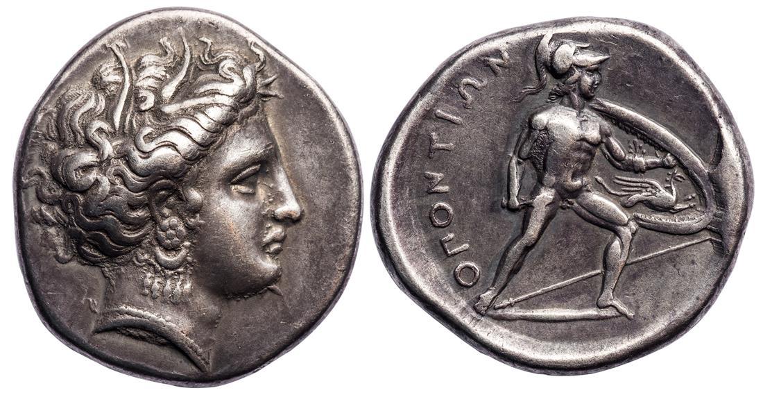 Lokris. Lokris Opuntia. AR Stater, ca. 369-338 BC. 12.06 gms. Wreathed head of Persephone of Euainetos type right, wearing earring with five pendants and a necklace, rev. OПONTIΩN, Ajax advancing right, wearing crested helmet and brandishing sword and shield – decorated with a griffin and small palmette on the inside, spear lying diagonally at his feet. Gulbenkian 495-496 (same obverse die), SNG Lockett 1693 (same obverse die), Jameson 1147. Lovely old tone. Choice Very Fine.