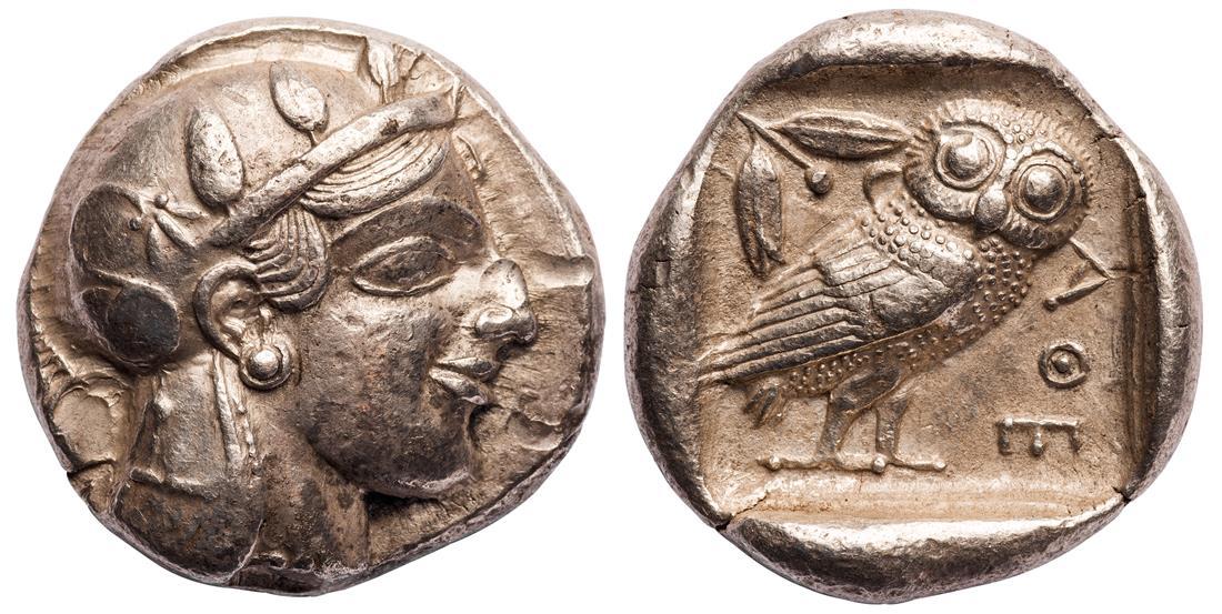 Attica. Athens. AR Tetradrachm, ca. 465/2-454 BC. 17.10 gms. Helmeted head of Athena right, wide face, rev. AΘE, Owl standing right, head tilted and facing, with spread tail feathers, olive sprig and crescent behind, all within incuse square. Starr Group VB, HGC 4, 1596, SNG Berry 647-8, Pozzi 1541. Two old test scrapes at obverse edge, Light gray. Extremely Fine.