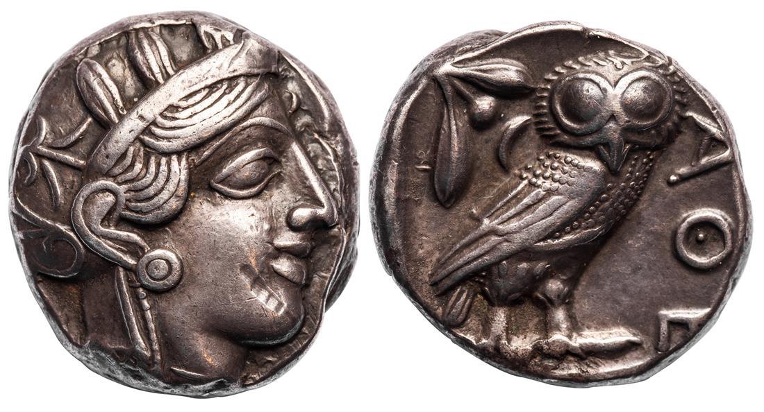 Attica. Athens. AR Tetradrachm, ca. 454-404 BC. 17.12 gms. Helmeted head of Athena right, with frontal eye, rev. AΘE, Owl standing right, head facing, olive sprig and crescent behind, all within incuse square. Kroll 8, HGC 4, 1597. Attractively toned over small old scrape on chin. Full profile. Near Extremely Fine.