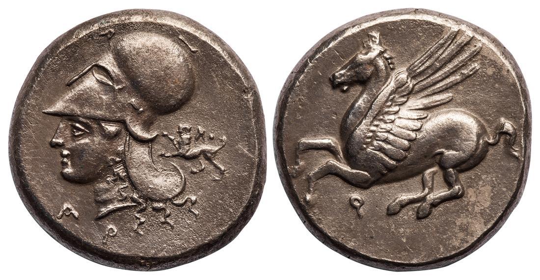 Corinth. AR Stater, ca. 345-307 BC. 8.59 gms. Pegasos flying left, small koppa below, rev. Helmeted head of Athena left, A before, P below chin, chimaera left behind. Pegasi I, 429, Ravel 1011. Very slight roughness. Good Very Fine.