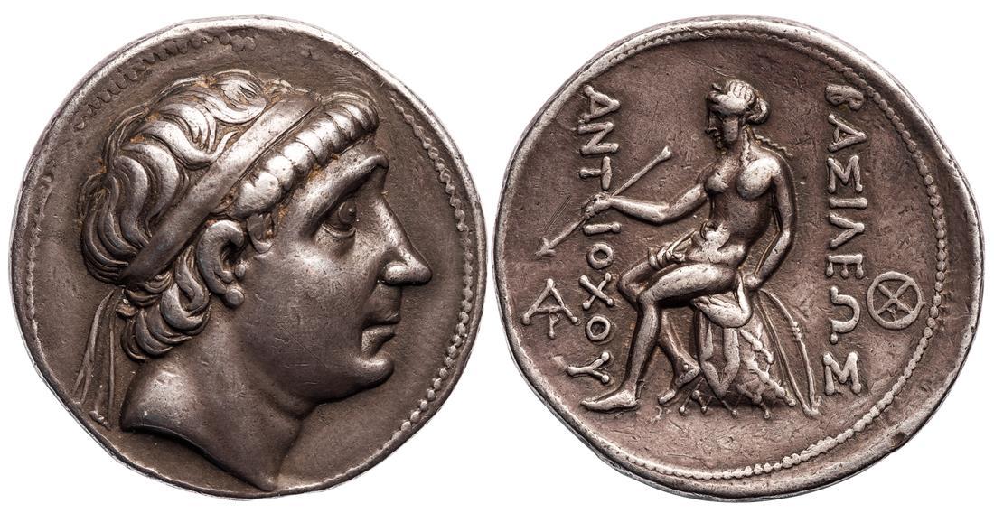 Seleukid Kings of Syria. Antiochos I Soter (280-261 BC). AR Tetradrachm. Seleukeia on the Tigris. 17.06 gms. Diademed head right, rev. BAΣIΛEΩΣ ANTIOXOY, Nude Apollo seated left on omphalos, holding arrow and resting other hand on bow, Ap monogram outer left field, X in circle monogram outer right. Newell ESM 155. Pleasing high-relief portrait. Medium gray. Good Very Fine.