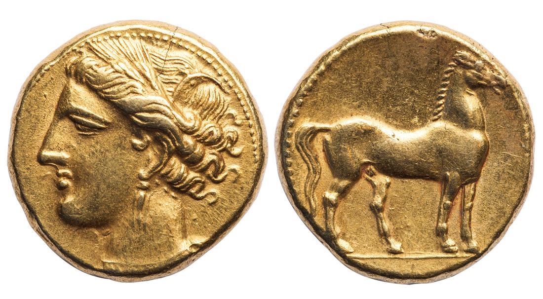 Carthage. EL Stater, ca. 290-270 BC. Carthage 7.48 gms. Large wreathed head of Tanit left, wearing triple-pendant earring and necklace, rev. Horse standing right on exergual line. Jenkins & Lewis 367, SNG Copenhagen 139, Jameson 924. Pleasing example. Extremely Fine.