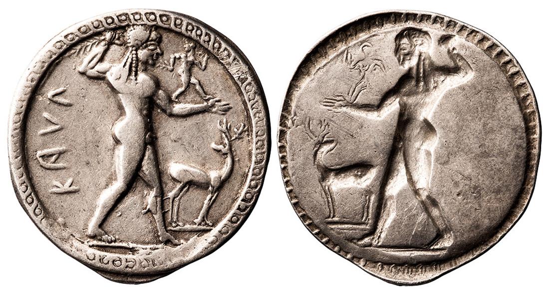 Bruttium. Kaulonia. AR Stater, ca. 525-500 BC. 7.96 gms. KAVΛ, Apollo advancing right, holding branch, small daimon running right on his left forearm, stag standing right before, head reverted, high antlers, rev. Incuse, no ethnic. Noe Group A, 9 (same dies), SNG ANS 144, SNG Lockett 579, HN Italy 2035. Lightly toned, a few minor hairlines on incuse side. Excellent metal quality. Good Very Fine.