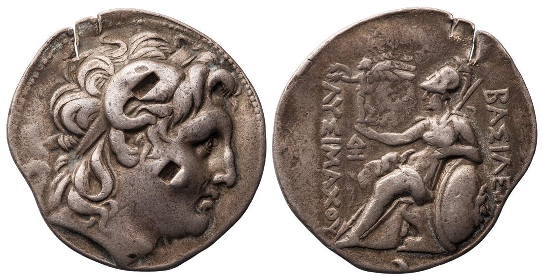 Kings of Thrace. Lysimachos (305-281 BC). AR Tetradrachm, struck 297/6-281 BC. Lampsakos. 16.48 gms. Diademed head of deified Alexander right with horn of Ammon, rev. Athena Nikephoros seated left, ΔΞ monogram inner left, crescent left in ex. Thompson 49, Müller 399. Two thin test cuts into upper edge, two rectangular obverse test punches. Toned Very Fine.