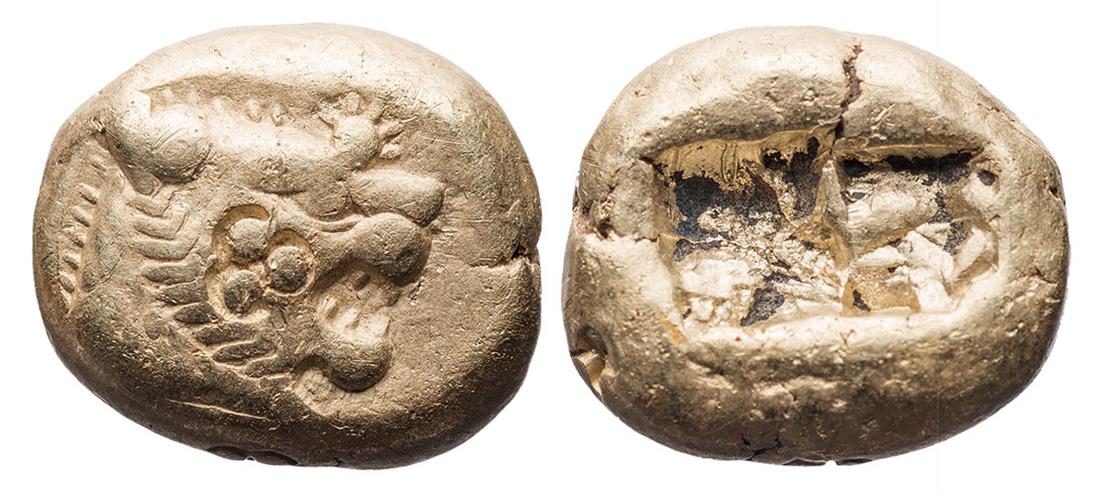 Kings of Lydia. Time of Alyattes-Kroisos (ca. 620/610-550/539 BC). Electrum 1/3 Stater - Trite. Sardes mint. 4.55 gms. Head of a roaring lion right, sun with multiple rays on forehead, rev. Incuse punch. Banker’s or countermark on lion’s cheek: triplex of pellets. Weidauer Group XVI, 86-9, Traité I 44, SNG Kayhan 1013, SNG von Aulock 2868-9, Rosen 655-6. Good Very Fine.