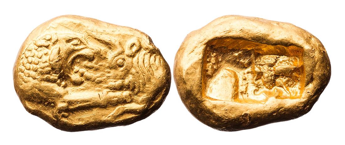 Kings of Lydia. Kroisos (ca. 564/553-550/539 BC). AV Stater. Light series. Sardes mint. 8.07 gms. Confronted foreparts of a roaring lion right with a tongue of five beads and bull left, rev. Two incuse squares. Traité I 401-3, SNG von Aulock 2875, Boston MFA 2073, SNG Lockett 2983 = Pozzi 2726, BMC 31, Dewing 2431, Gulbenkian 757. Bold details. Lustrous. Superb Extremely Fine and about as struck.